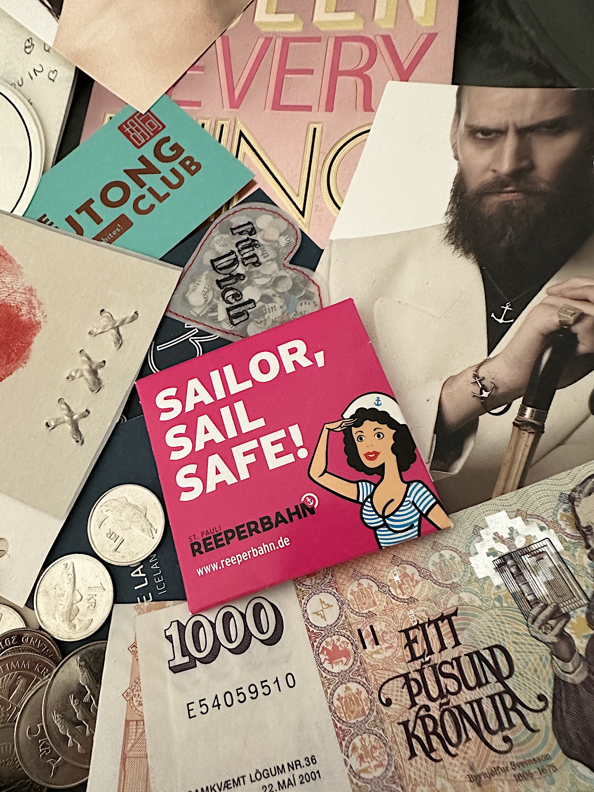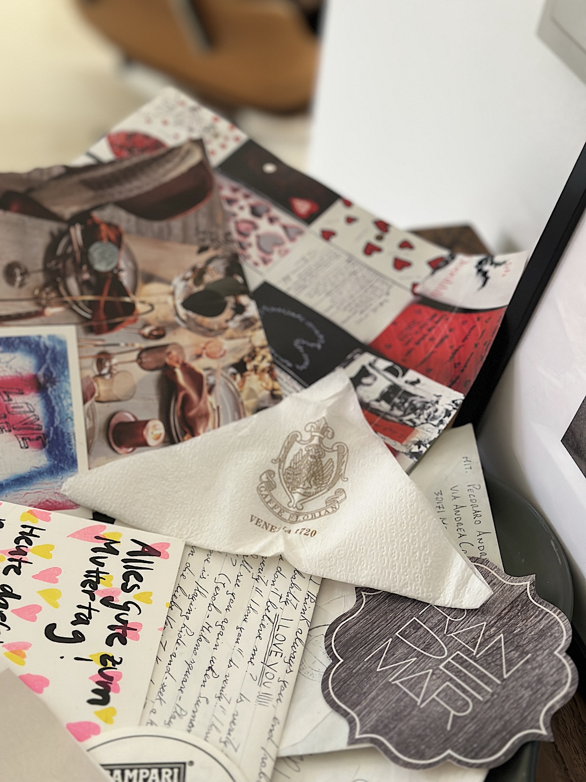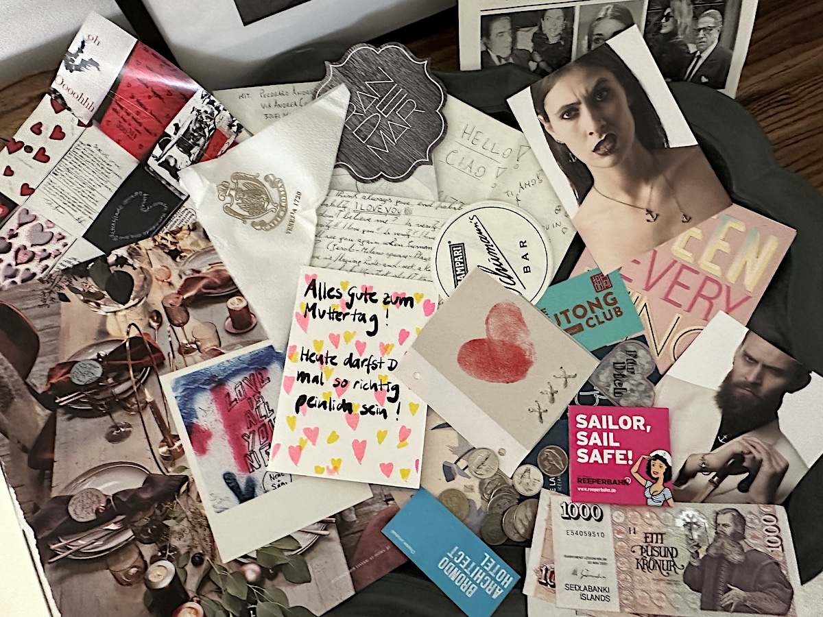 Hotelprospekte, Flyer, Visitenkarten, Postkarten unbeschriebene und erhaltene, Briefe, Stifte, Zeitschriften, Ausrisse aus Zeitschriften, die nicht aufhebenswert waren. Bilder sowieso. Schöne Kronkorken, Geld aus anderen Ländern (wie lange haben wir eigentlich schon in vielen Ländern den Euro?). Aus den Hotels die Kosmetikproben, aus Cafés die Zuckertütchen, Eintrittskarten von jedem Kino-, Museums- und Konzertbesuch. Restaurantrechnungen (die werden ja oft in so schönen Hüllen gebracht, zu schade zum wegwerfen). Einfach alles. Und gefühlt die letzten 20 Jahre…