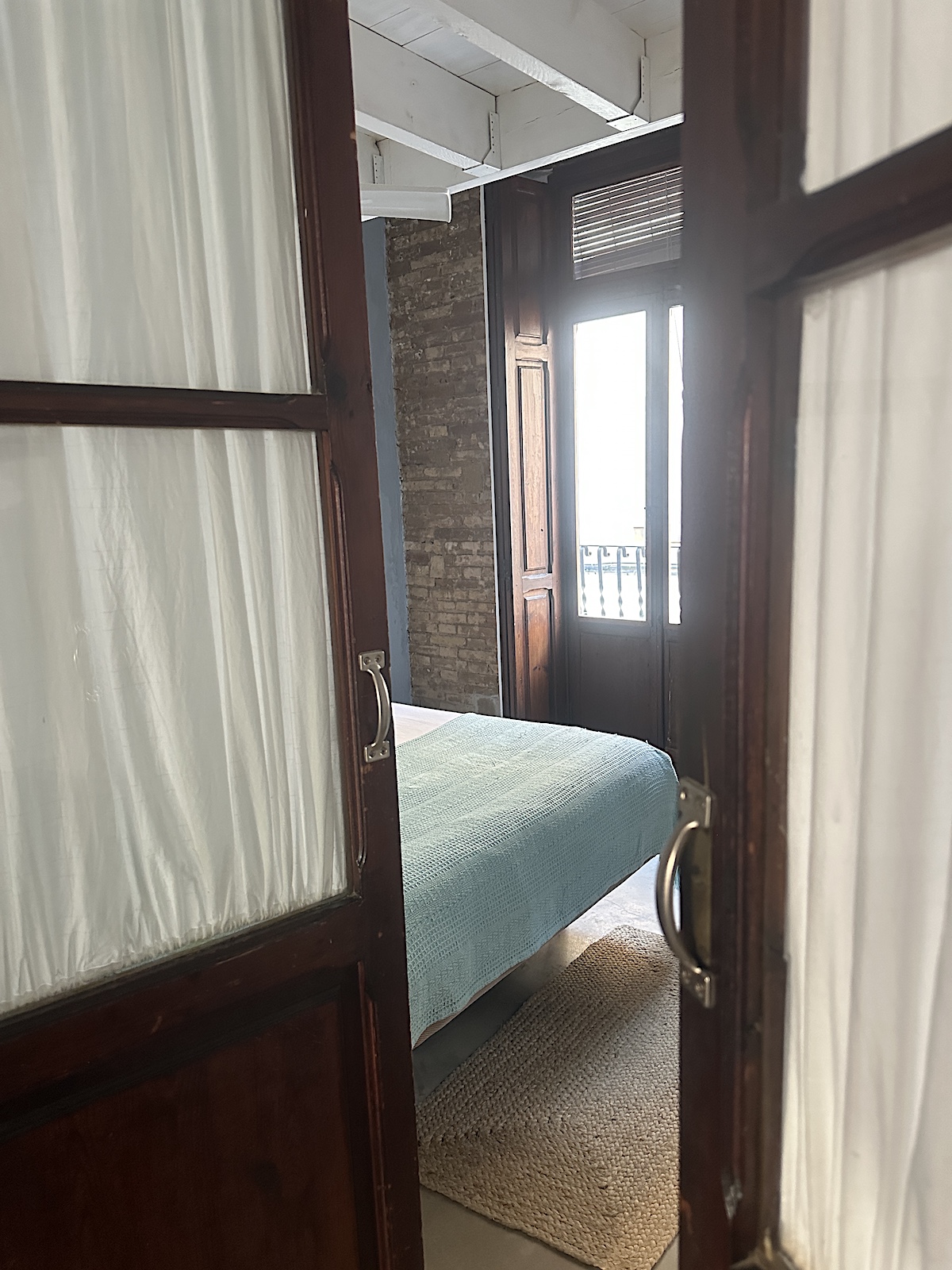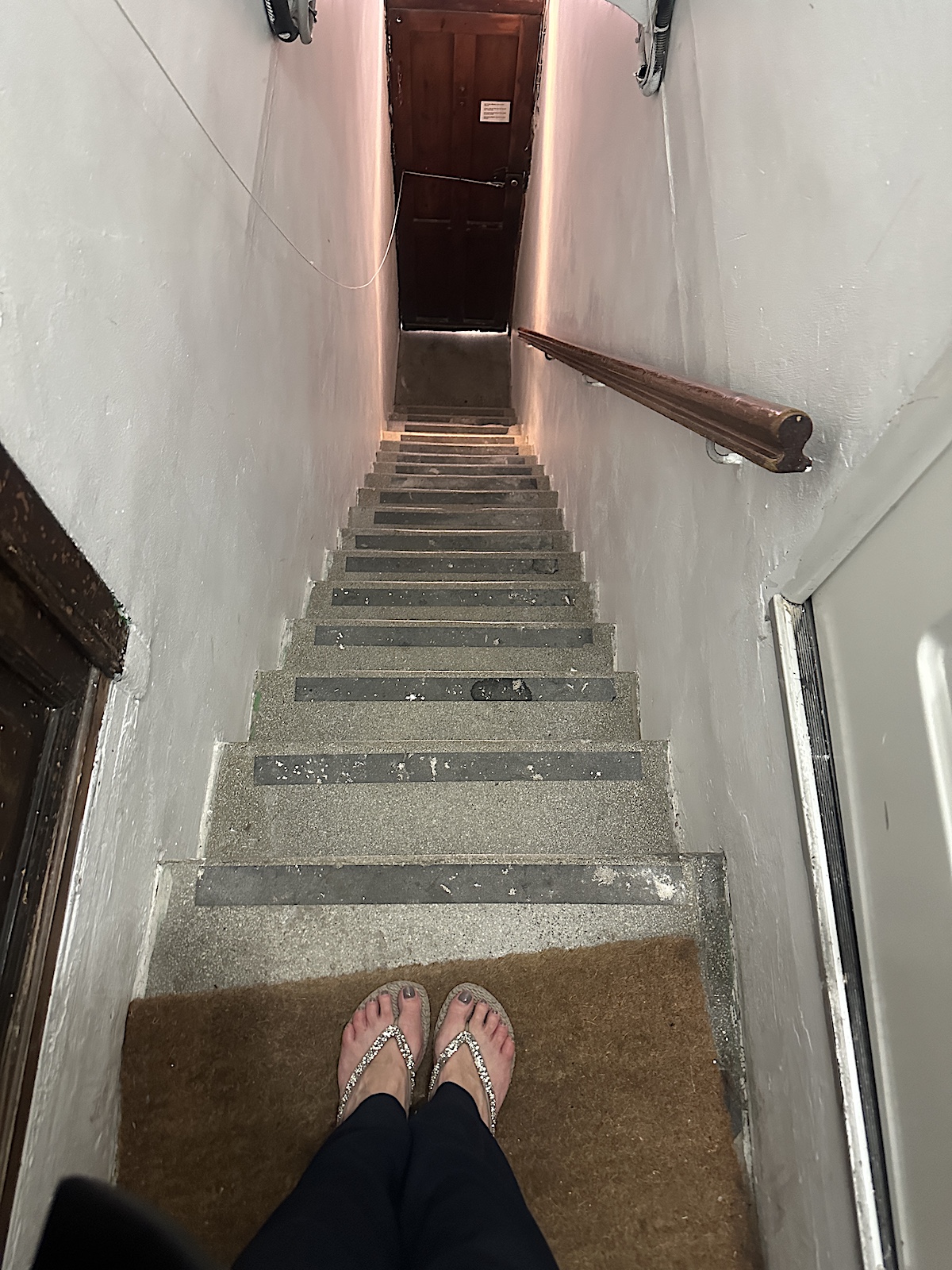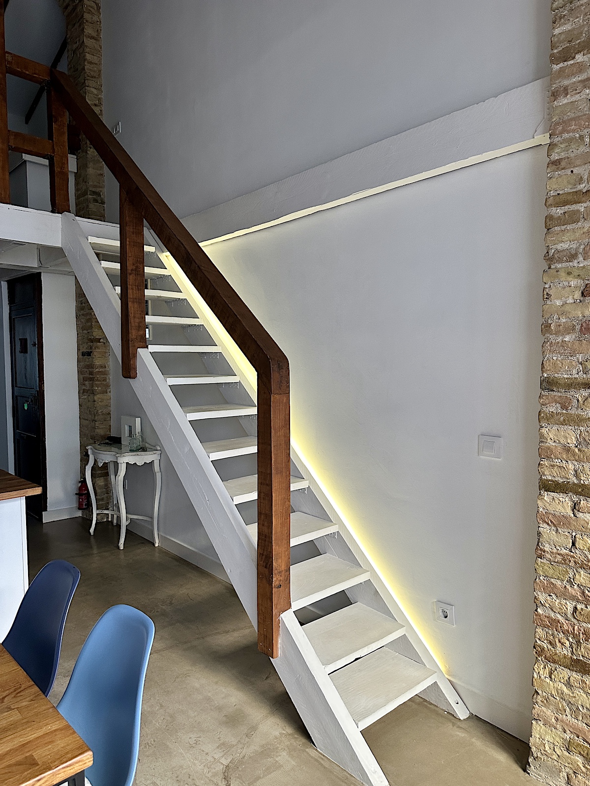 Der Aufgang zur Wohnung ist etwas abenteuerlich, aber auch typisch für ein El Cabanyal Haus. Eine ganz schmale, enge, steile Stiege. Auf dem Bild stehe ich oben, links ist meine Tür, die braune, rechts, die weiße, ist von Miguel, meinem vecino (Nachbarn). Es war eine Challenge meinen 20 kg Koffer hier hoch zu bekommen, bin paar Mal gestrauchelt. Ich frage mich, wie die hier die Möbel in die Wohnungen bekommen. Da muss ich mal meine Vermieterin fragen.